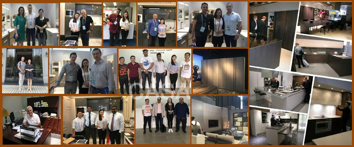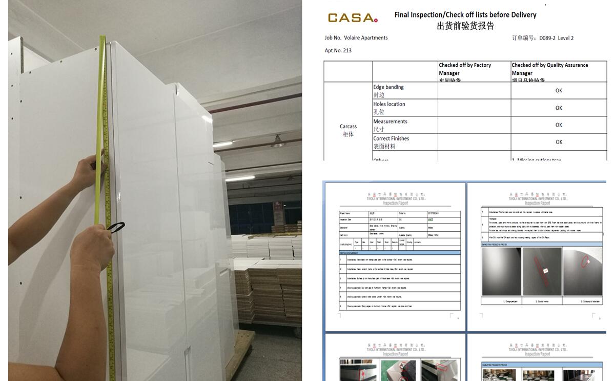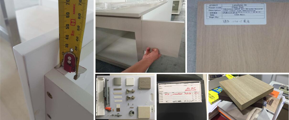 We can provide the colors, materials, and craftsmanship required by the customer's project. Usually, customers send color blocks to our factory, and we create a sample. At the same time, we will create a sample frame to display the door panel color, cabinet color, edge color, door hinge, track and countertop color required for this project. After confirming all of these, we will proceed to the mockup confirmation process.